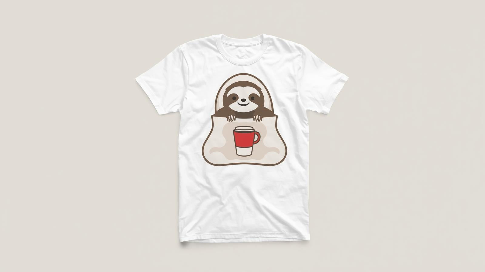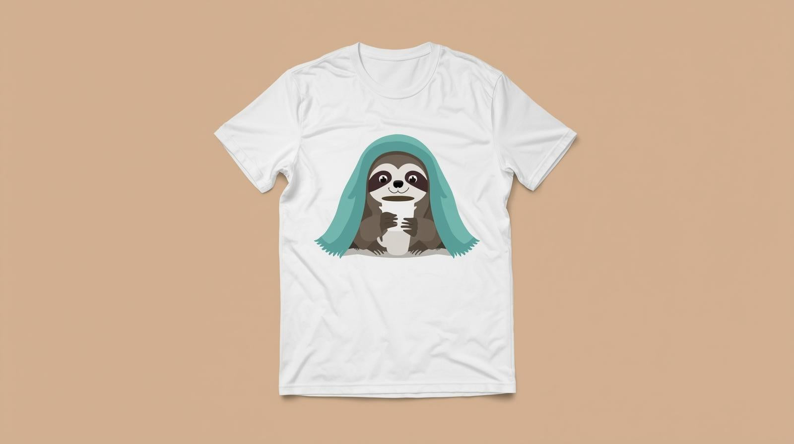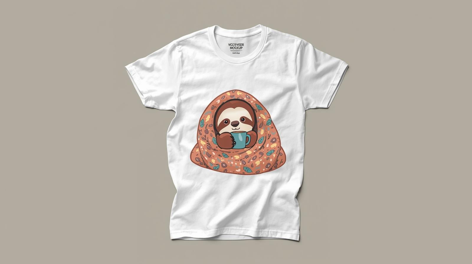 A cute sloth under a blanket, holding a coffee mug with headphones on. Caption: “Introverting Hard.” Cozy, relatable humor.