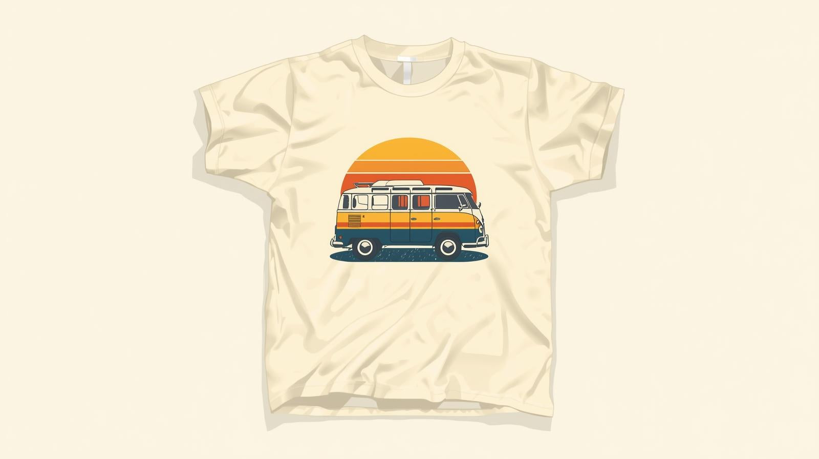 A vintage camper van cruising through a desert with cactus silhouettes and a warm retro sunset backdrop. 70s vibes, nostalgic and adventurous.